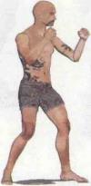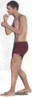 身体要以侧面朝向对手(图2-1-9),以胸、腹的左侧对着对手这样可以有效减少遭受攻击的面积并且不会影响自己出拳的动作。上体略前倾自然含胸收腹髓关节自然放松,臀部内敛切勿下坐、后撅或扭臀。