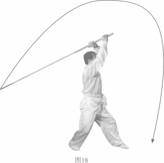 3 .右脚撤步,顺势拨棍,棍举身后,目视前方。(图18)