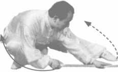 Shift body weight backward and bend right leg down to form left crouch step, strike the cudgel down to the ground, look at cudgel-tip. (Fig 19)