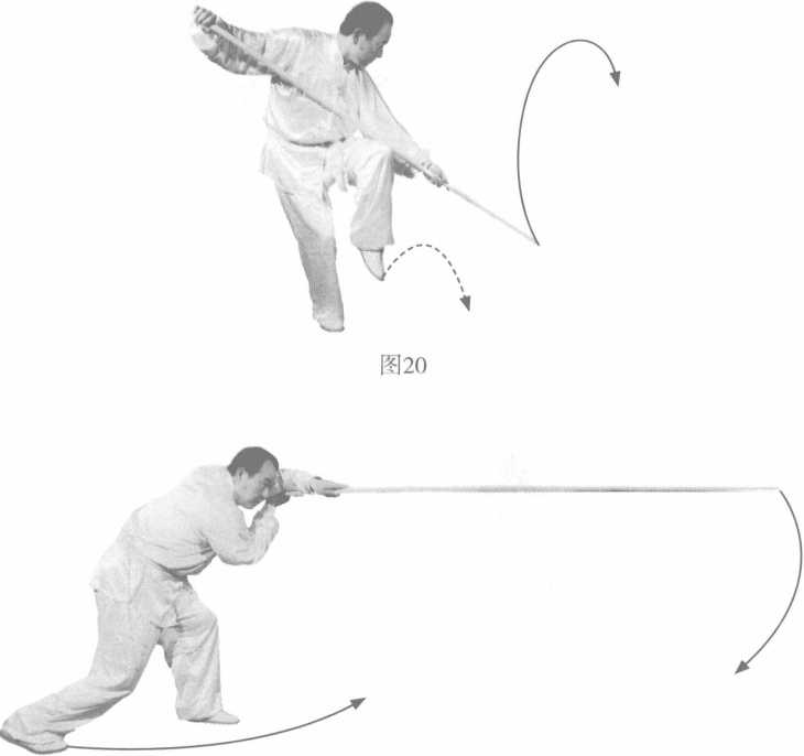 Shift body weight backward, lift left knee up, left hand looses the cudgel and right hand carrys up, look forward. (Fig 20)