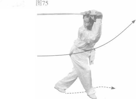 2 .右脚盖步,上体左转,左手滑把,双手合力,由左向右,举棍下 点,力达棍梢。(图76)