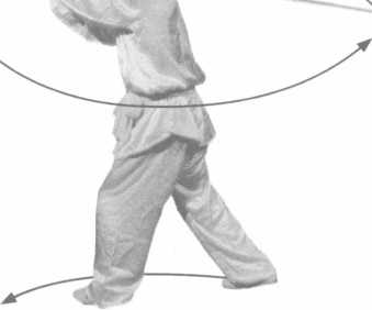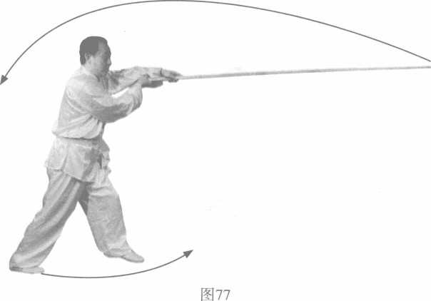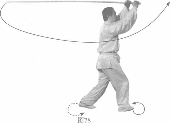 )4()4(Left foot as axis to turn body left, right foot steps forward, keep on sweeping cudgel flatly. (Fig 78, Fig 79)