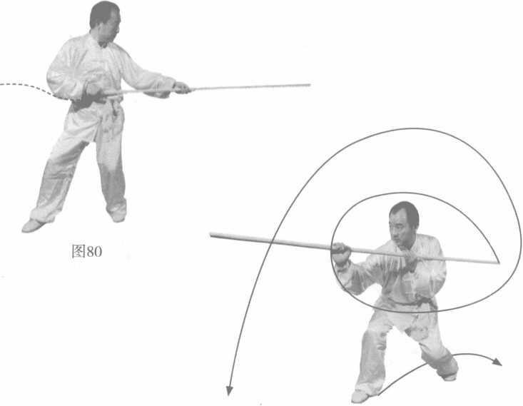 3 .身体右转,双手滑把,重心下移,顺势戳把,目视棍把。 (图 80、图 81 )