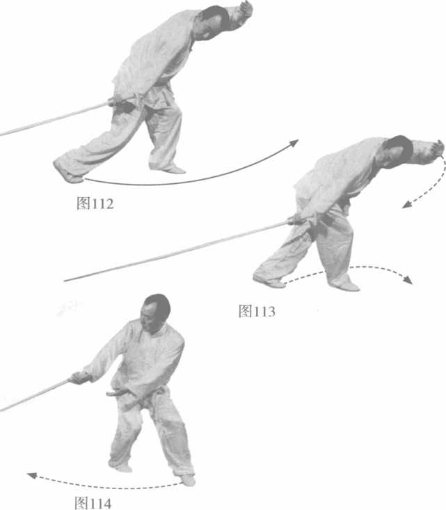 三十三、左右劈波Tilted Cudgel Left and Right三十三、左右劈波Tilted Cudgel Left and RightCRAZY SPIRIT CUDGELCRAZY SPIRIT CUDGEL1.两脚碾地,右后转身,目视右后。(图114)1.两脚碾地,右后转身,目视右后。(图114)Turn body back-right with feet swaying slightly, look at back-right. (Fig 114)Turn body back-right with feet swaying slightly, look at back-right. (Fig 114)Turn body left, drag cudgel backward and step forward. (Fig 112, Fig 113)|疯魔棍
