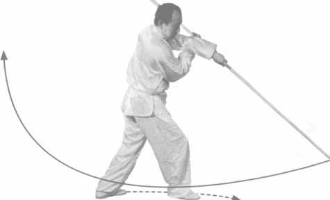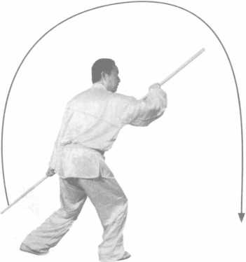 1.身体立起,上体右转,双手滑把,贴身舞花,目视前方。