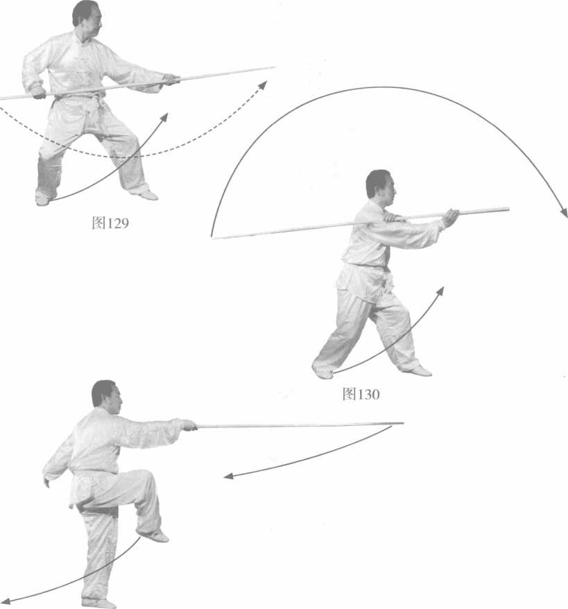 4.右脚后落,右手后拉,左手接棍,目视前方。(图132)