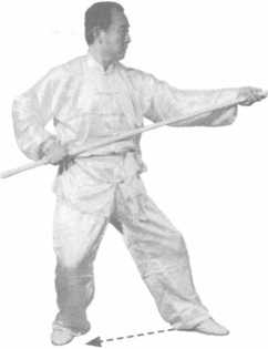 Right foot lands backward, right hand drags backward, left hand takes cudgel