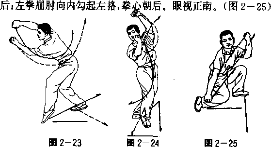 左脚朝左后退步右脚收点面朝东南成右虚步同时两手仍握单珠拳向下向右上击出身体略前探略扭转,左拳高及头顶拳心朝左右拳高及下颔拳心朝左后0眼视西南(图2—24)
