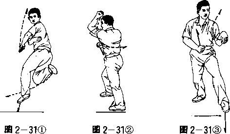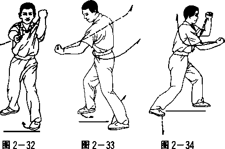 (2)左脚落步随之右脚朝西北进步左掌变拳上提屈肘拳心朝后右掌变拳收在左腋下拳心朝下。眼视正西(图2—312)