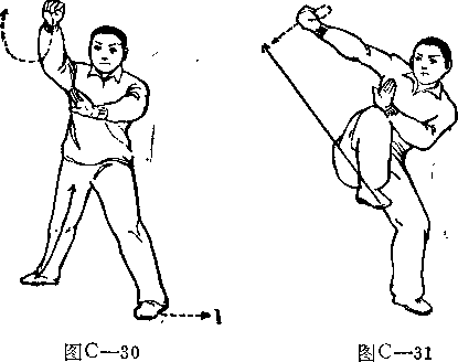 左脚左前弧形上步,屈膝半蹲右腿伸直成左弓步口上体右转。左臂内旋由外向内划弧立学横于胸前掌心向下掌指向右孑同时右掌变拳步右臂内旋向外向前、向上划弧摆拳略屈时停于右前上方稍高于头拳心向卞两眼平视。(图-30) _