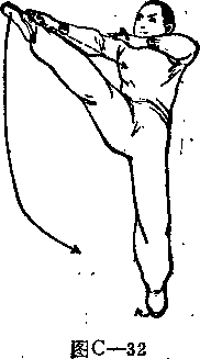 (2)上动不停右脚向右上方弹踢与肩同高左腿伸直。同时右臂外旋勾手变掌向前拍击右脚面手左手桧肘直腕附于胸前与肩同高掌心向下掌尖向着口眼视右脚。(图-32)