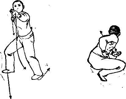 (1)左脚向左躇出半步屈膝华蹲事右腿提滕脚面内