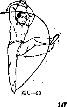 (2)上动不停右腿向右上外摆脚面绷紧两手先左后右拍击右脚面左腿屈膝脚尖绷直收扣于左瘠下。同时体右转前倾。眼视右脚尖口(图—)