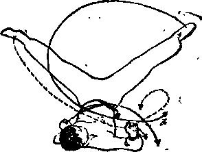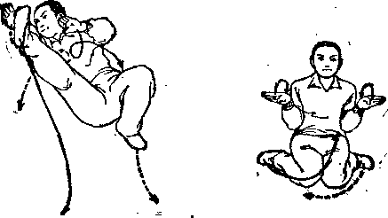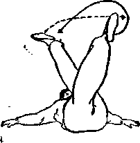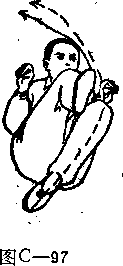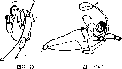 (2)右腿向左后猛归,左腿微向前锤摆,两腿上举相绞,左脚在前右腿在后,身体随之翻仰肩背部随绞腿住地上旋转一周同时两臂向同侧伸直双掌伏地左掌尖朝左右掌尖朝右。眼视上方。(图—95)
