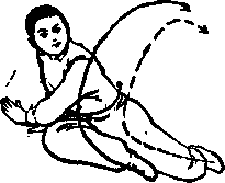 ⑴体左转侧卧,左腿向前弹踢脚尖勾案朝左,右腿向下、向外、向后划弧摆扫伸直置于詹加脚面绷直大