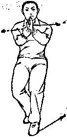 左脚向左后侧落步双腿屈膝半蹲成两前臂外旋向同侧开摆略比肩宽两上臂内侧紧贴脑旁双时尖内夹