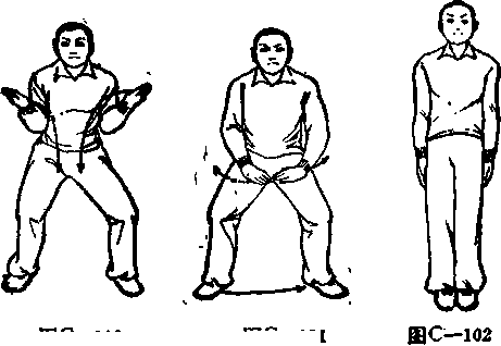 80收势右眼向左脚靠拢并步宜立两臂外旋伸直自然下垂五指并拢贴箧于两腿外恻两眼平视(图-102)