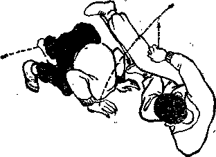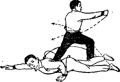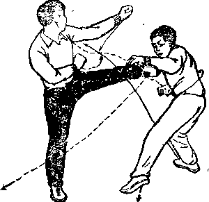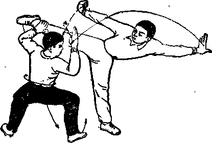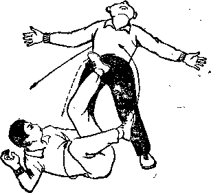 (2)乙右腿后插步,体右转180度并攀向后摆°甲体左转仰卧右腿屈膝护裆左腿屈膝外摆踢乙腹部左手抓乙左踝左掌屈肘置于右肩上。甲被击后重心上升两臂外摆体后仰欲倒。(图-84)