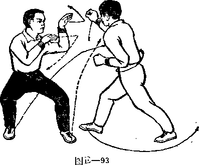 ⑵乙上体左转左倾同时两腿蹬地跳包身体腾空⑵乙上体左转左倾同时两腿蹬地跳包身体腾空(1)乙团身后滚翻立起成左马步两裨屈肮左掌置于休左前上方右掌拉于胸前。甲上体使劭前俯两腿下压立起成右弓步右拳击向乙面部左拳收抱于腰间口(图—93)