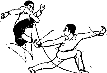 (1)甲右腿前落,上体前倾左拳收抱于腰间右拳欲击乙两腿。甲上体接近乙双脚时乙两腿蹬击甲腹部两手直臂左右开摆内侧贴地。