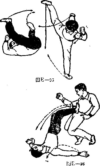 (3)甲重心移于左腿上体左倾右腿侧踹乙双腿双勾手变拳力臂后摆,左拳屈肘于左上方。乙体右转落地仰卧两胞屈膝上顶两悻屈肘置于头上0(图—95),