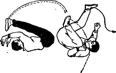 (2)甲右手变爪抓乙右腕,施之左腿伸向乙两脚之间屈膝紧勾乙右小腿同时休右一转至乙体后倒地仰卧左臂屈肘反撩乙左小腿右腿瞪乙臀部口乙被击后重心上升。(图—99)