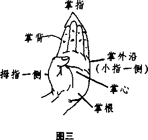 3- 掌:四指并拢伸直,拇指曲扣虎口处(图三)。