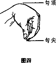 4.勾:五指第一指节捏拢,屈腕(图四)。