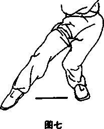3- 虚步:两脚前后开立。前脚脚尖点地微内扣,腿微屈;后 脚脚尖外展45。,屈膝半蹲,重心落在后脚上(图七)。左脚在前 称“左虚步”;右脚在前称“右虚步”。