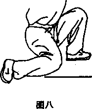 4- 单跪步:俗称单蝙蝠步。一腿屈膝深蹲,另一腿大腿膝盖 跪地,跪地腿的小腿内侧靠近下蹲之脚,并贴于地面(图八)。
