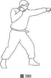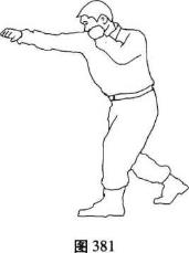 左摆拳在格斗势的基础上左脚蹬地使身体稍向右转左拳向左前伸出转向右下横击左拳内旋拳心向左稍向下力达拳面右拳收于下颌目视前方(图380)。右摆拳在格斗势的基础上右脚蹬地,上体稍向左转右拳向外、向前、向里横击右拳内旋力达拳面目视前方(图381)。要点转腰出拳一致不能向后引拳肘尖微抬与肩略平。用途击打对方的头部及肋部。