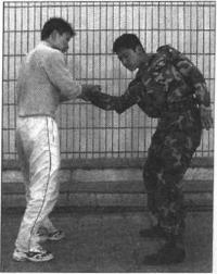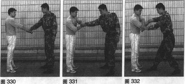 准备姿势敌在我正面我右手抓握敌右手腕(图330),敌左手扣握住我右手手背右手反拧我右手腕(图331)。