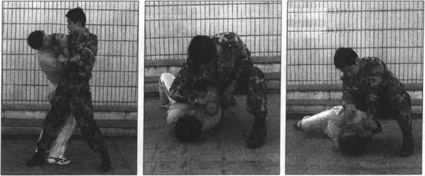 顺敌反拧腕下蹲推抓左手突然与横顶肘、别绊腿配合协调。敌倒地后不要对敌放松警惕应迅速将敌由仰卧成俯卧防敌挣扎反攻。