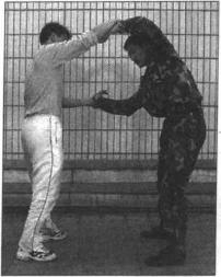 2 我左脚前上步而后右腿向敌右腿后上步绊住敌腿右手反拧敌右手腕向上推并屈右臂用肘横击敌下颌(图333)。