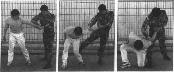 挑击突然、有力扣手背紧蹬膝与左手回拉配合协调折卷手腕于压肘同时。必要时推手使敌倒地成俯卧姿势搜身。
