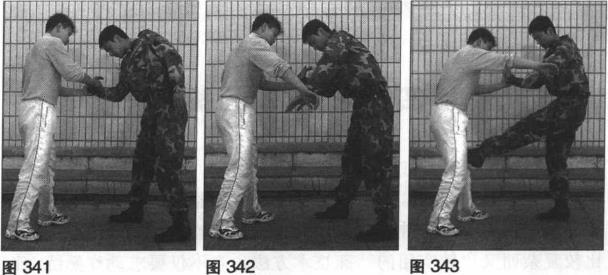 2 左手扣握住敌折卷我左手手背左脚回撤步(图344)。3 左手反拧敌左手手背右臂屈肘上抬下压敌左小臂右手顺2 左手扣握住敌折卷我左手手背左脚回撤步(图344)。3 左手反拧敌左手手背右臂屈肘上抬下压敌左小臂右手顺势解脱敌之控制(图345)左手折卷敌左手腕右肘下压敌左肘关节使敌下蹲左膝跪地(图346),将敌制服。反击要点格挡敌小臂突然弹踢裆准扣手背牢下压肘与反拧折腕配合协调。必要时可将敌下压至俯卧姿势控制。势解脱敌之控制(图345)左手折卷敌左手腕右肘下压敌左肘关节使敌下蹲左膝跪地(图346),将敌制服。反击要点格挡敌小臂突然弹踢裆准扣手背牢下压肘与反拧折腕配合协调。必要时可将敌下压至俯卧姿势控制。图344图344