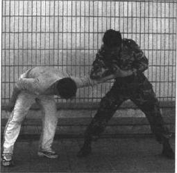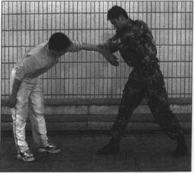 格挡敌小臂突然弹踢裆准扣手背牢下压肘与反拧折腕配合协调。必要时可将敌下压至俯卧姿势控制。