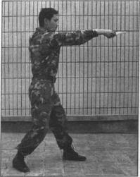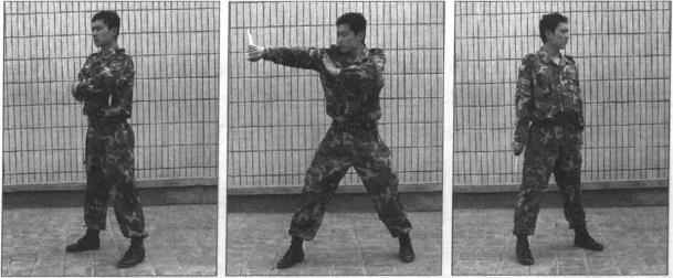 此姿势与平常站立姿势相似,匕首藏于右腿后隐蔽性强具有突然发起攻击的准备又可腾出左手。一旦需要进攻可左脚上步右手直线攻击对方胸、腹部或曲线攻击敌方胸、腹部(图523)