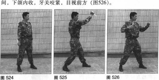 右手正握匕首右臂自然下垂于身体右侧使匕首藏于右腿右侧后方左脚向前一步上体半面右转目视前方(图522)。