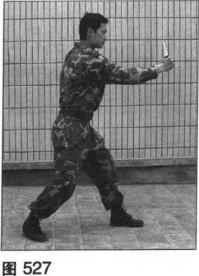 此姿势的特点是实距性强前有可攻可防的前手拳后有致命一击的利刃其防守严密进攻迅猛适用与犯罪分子进行格斗时的准备姿势。在此姿势下可用左臂做格、架、挡、截、击等攻防的动作亦可用匕首以上挑刺(图527)、直刺、下扎、斜砍、横扫等方法攻击敌方。要求身体姿势自然含胸收