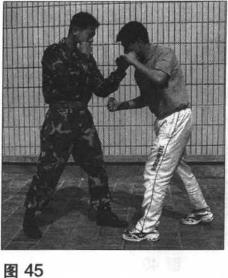 在与对手格斗中对手用右勾拳攻击我腹部(图45)。我左臂屈肘用小臂由上向下格压对手右小臂(图46)。完成防守后快速做出反击如用右摆拳击打对手头部等。