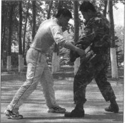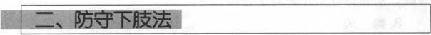 在与对手格斗中对手起右横踢(右鞭腿)向我攻击我左大臂贴接身体左小臂由下屈肘抱住对手小腿右小臂挟报对方小腿(图48)。或在与对手格斗时对手用右蹬腿向我攻击我身体左转右脚后撤躲开对手进攻同时以左臂抄抱对手进攻之小腿(图49)。
