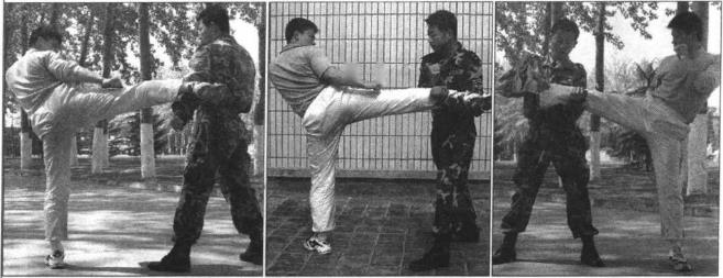 当对手起右腿弹踢、横踢我裆部、肋部时我立即向后撤右步两腿微屈左臂屈肘用小臂由上向外、下格挡对手右脚(图47)