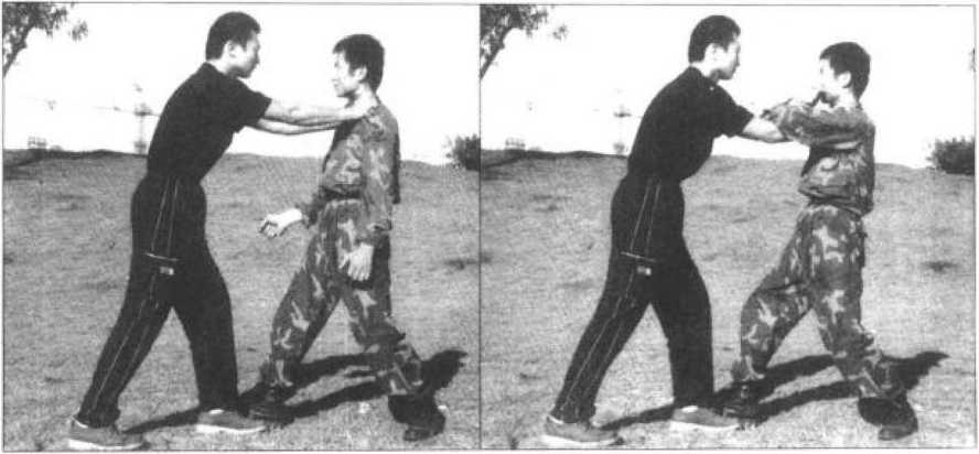 4 不待敌方闪避或逃脱我早已在猛然向左后方转身的同时突发左肘去后撞其心脏要害处(图199)并连续用左拳捶击其裆部(图200)。