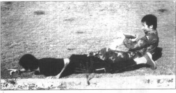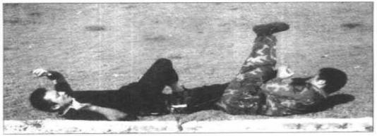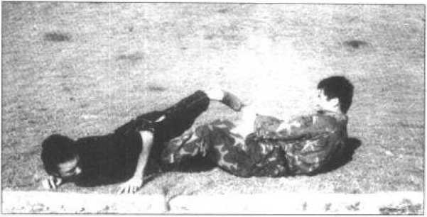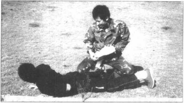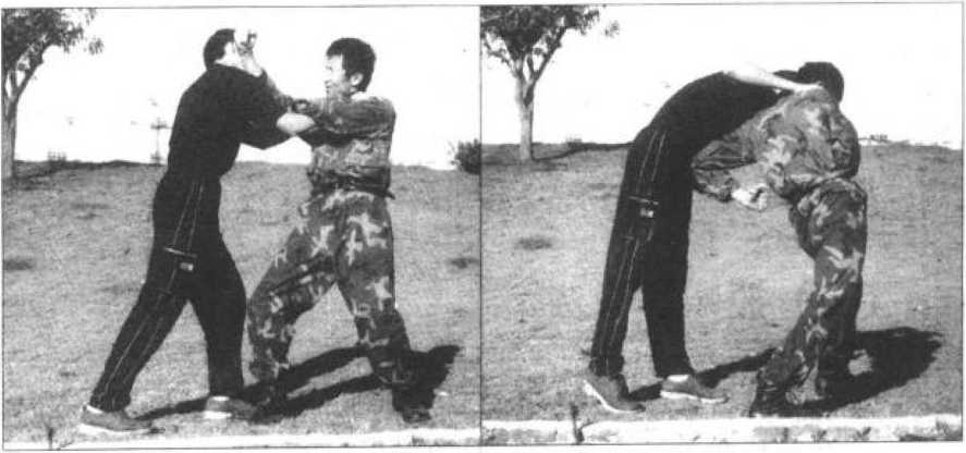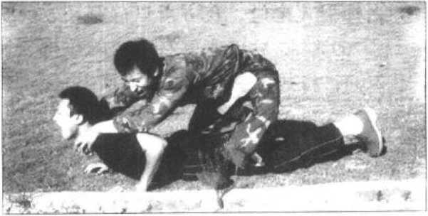 8 最后我可再在将其右小腿压叠于大腿上并用腹裆压牢的瞬间以双手由前向后扳牢其喉颈并猛力向后拉(图207),使敌方因右腿及腰背剧痛难忍而屈服落败。