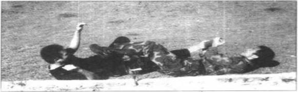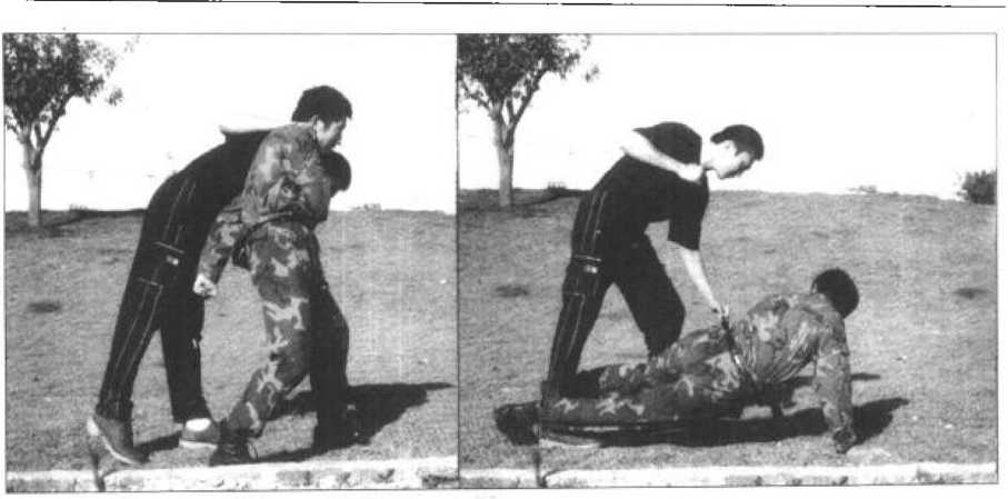 6 随后迅速向左后方转身而把敌方绞翻在地当然在敌方倒地后应立即用左脚跟去砸击其裆部或面部(图202、图203),在敌方的意料之外得手这个时候我仍需锁牢敌右腿。