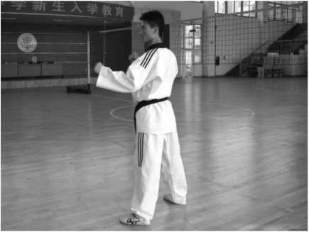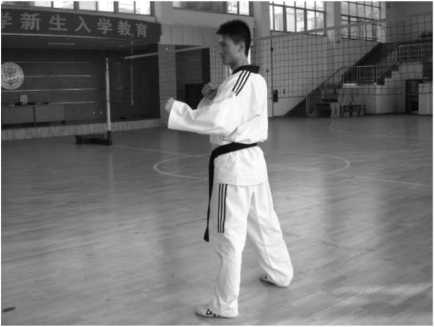图2 - 121 在收脚落地之前,迅速 的转胯并抬起左脚