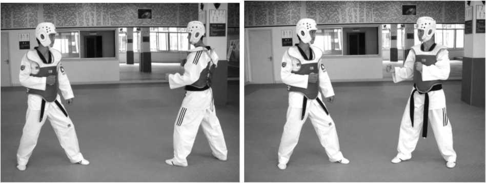 前踢进攻主要攻击部位有面部、下颌、腹部、裆部。其动作要点为膝关节夹紧, 小腿放松,要有弹性;往前送,高踢时往上送;小腿回收与前踢的速度一样快;脚背 绷直,脚趾往上钩。1.滑步前踢头部2.上步+后前踢头部图2 -134 双方闭式站立图2 - 135 红方右脚上步,拉近距离图2-136 左脚抽膝前踢击打蓝方头部图2-136 左脚抽膝前踢击打蓝方头部图2 -137 收脚返回图2 -137 收脚返回图2-136 左脚抽膝前踢击打蓝方头部图2-136 左脚抽膝前踢击打蓝方头部图2 -137 收脚返回图2 -137 收脚返回