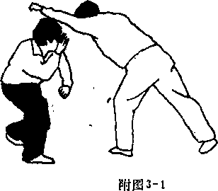 (1)接上势,左脚向左侧斜闪成左跪步,腰身左拧。同时右拳下栽于体前,拳心向内,右拳护于右 肩侧,目视右前方(图3—5)。图 35 (2)上动不停,右脚向右侧闪挪成右跪步。同 时腰身右拧,左手随拧转之势下截于体前,右手上提 护于左肩侧,目视左前方(图3—6)。图36用法:扎衣势为决斗时的开门架势,其动作照高 管下,横行直进,诸势可变,有闪躲之妙。”比如敌 洵我袭来,我迅逮斜闪避其来势,速即伺隙而进,击 其要害(附图3—1)。要点:左右闪进要快,要拧腰关裆。动作不宜过 大,要有速进反击的意识。