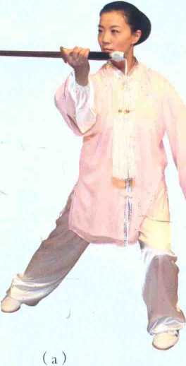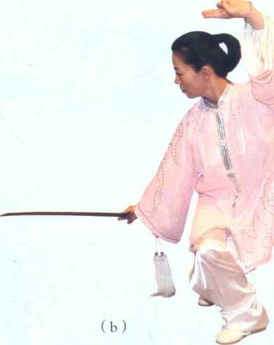 1 .重心左移,身体略左转;随转体 右手握剑,以剑柄领先,屈肘向右带剑至 面前,手心朝后;左手剑指弧形左摆至左 胯旁,手心朝下,指尖朝前;继而重心再 右移,左腿经右脚后向右插步成叉步;同 时右手握剑略向左带后内旋翻、手心朝 下、向右格带,腕有胸高,手臂自然伸 直,剑尖朝前,与肩同高;左手剑指向 左摆举,腕同肩高,手心朝外,指尖朝 前;目视右侧。〔见图29 (a) (b)〕